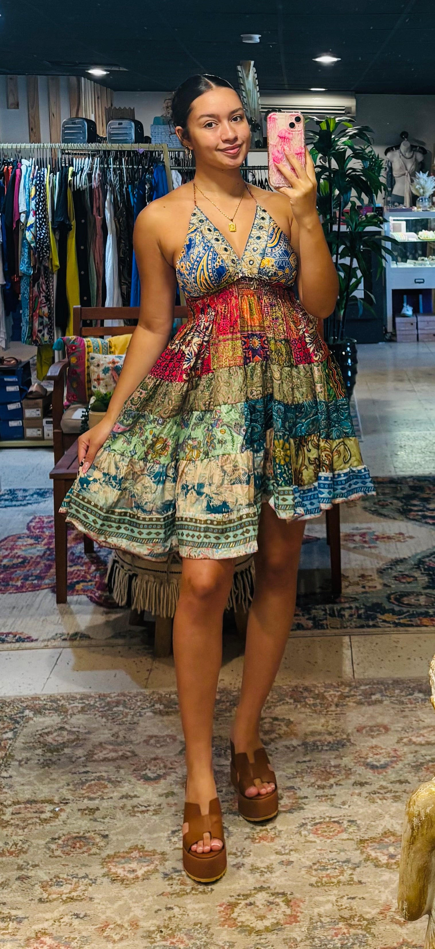 Vestido Corto Halter con expandex en el área de la espalda, cristales en el área del busto para un toque boho. One Size corre desde small hasta 1XL.